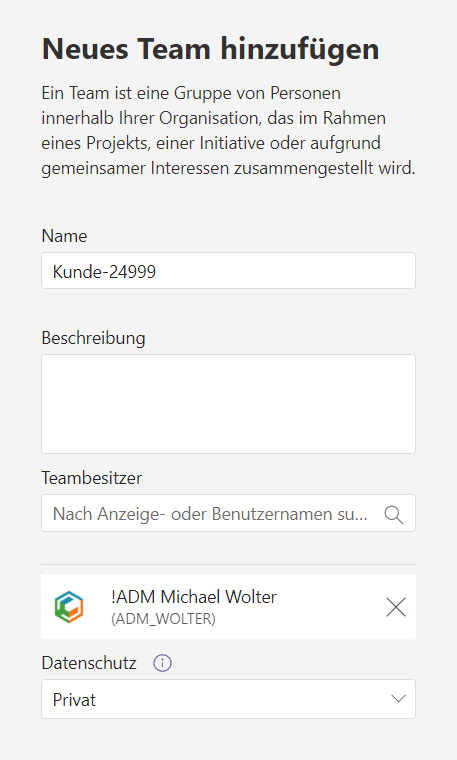 Nach erstellen des Teams, wird das Team in den entsprechenden Kunden umbenannt.