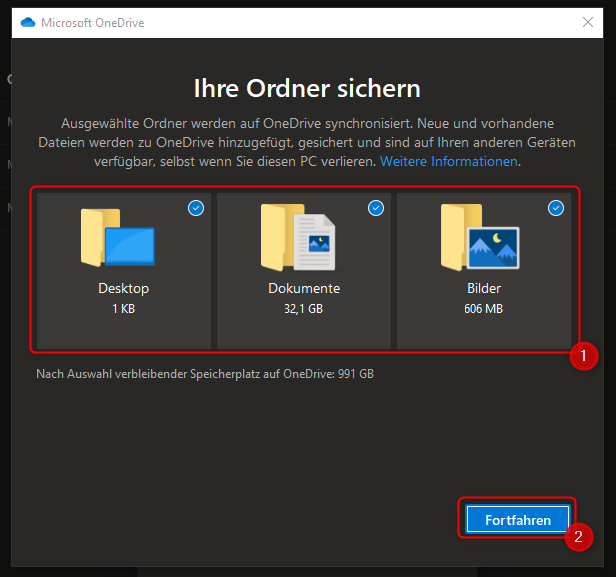 - Wählen Sie aus, welche Daten von Ihrem Pc in OneDrive Synchronisiert werden sollen.