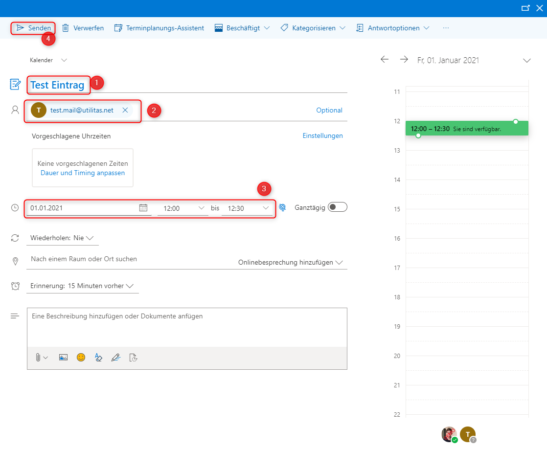 Kalendereintrag bearbeiten Wählen Sie Ihren zu bearbeitenden Termin in Ihrem Kalender aus. Wählen Sie nun „Bearbeiten“ Nun können Sie Ihren Eintrag bearbeiten. Oben links können Sie Ihre Änderungen Speichern.