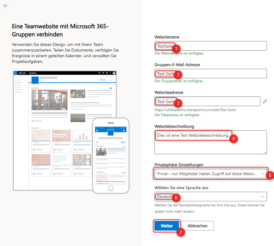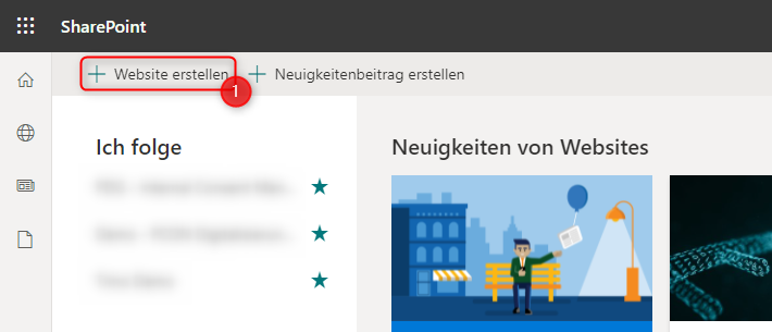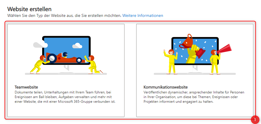 - Wählen Sie zwischen zwei Websitearten aus. (z.B. Teamwebsite)