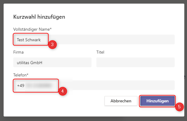 - Füllen Sie nun die von Ihnen gewünschten Informationen aus und Speichern Sie diese Kurzwahl mit dem Klicken auf „Hinzufügen“.